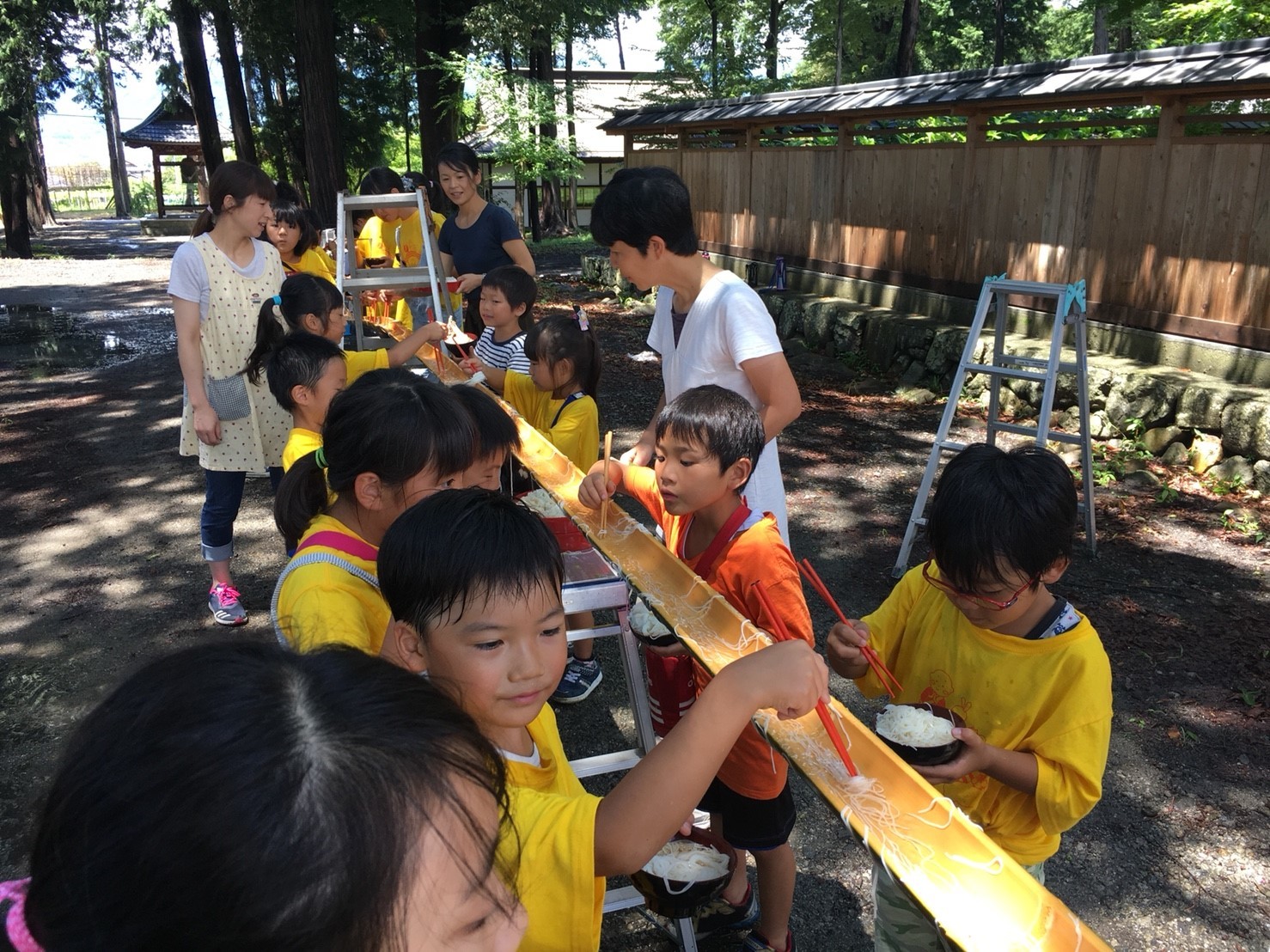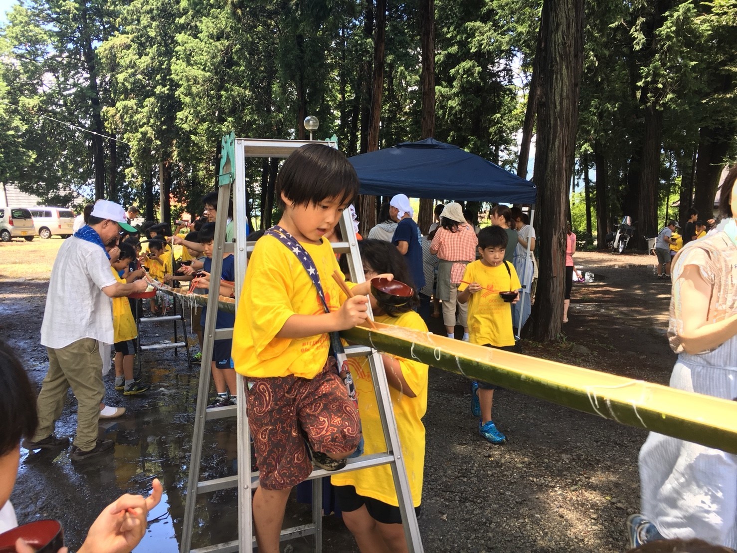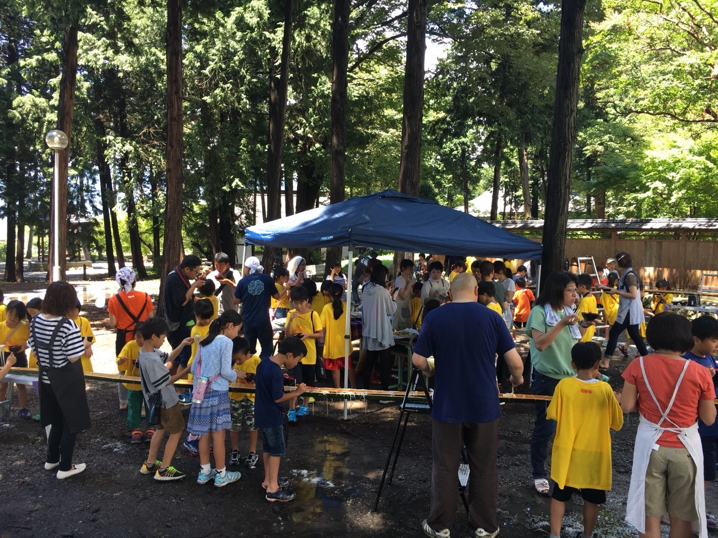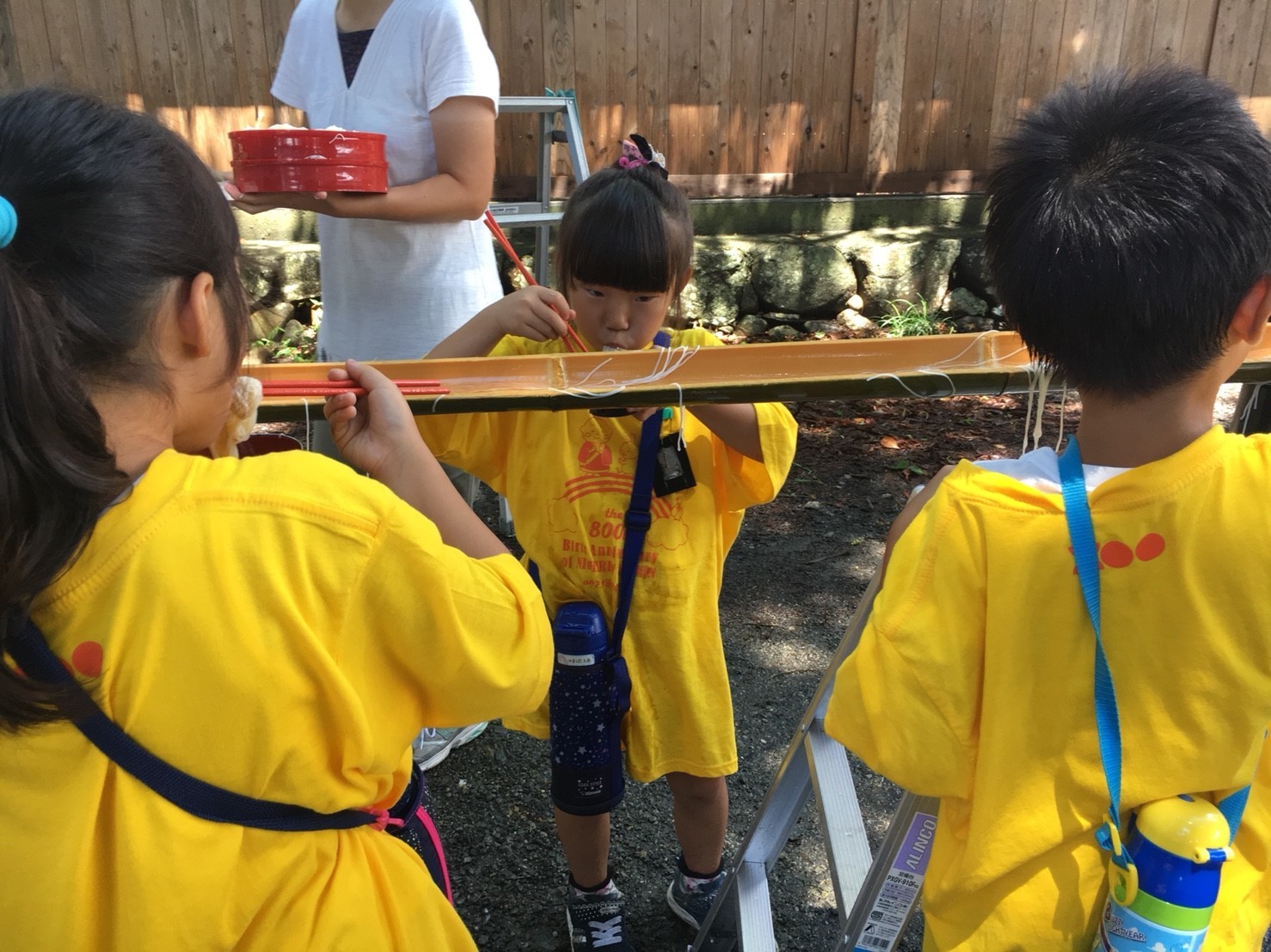 3日目のお昼はお父さんやお母さん、お迎えのご家族の方々も一緒に流しそうめんをしました。総勢100名ほどの流しそうめんです。