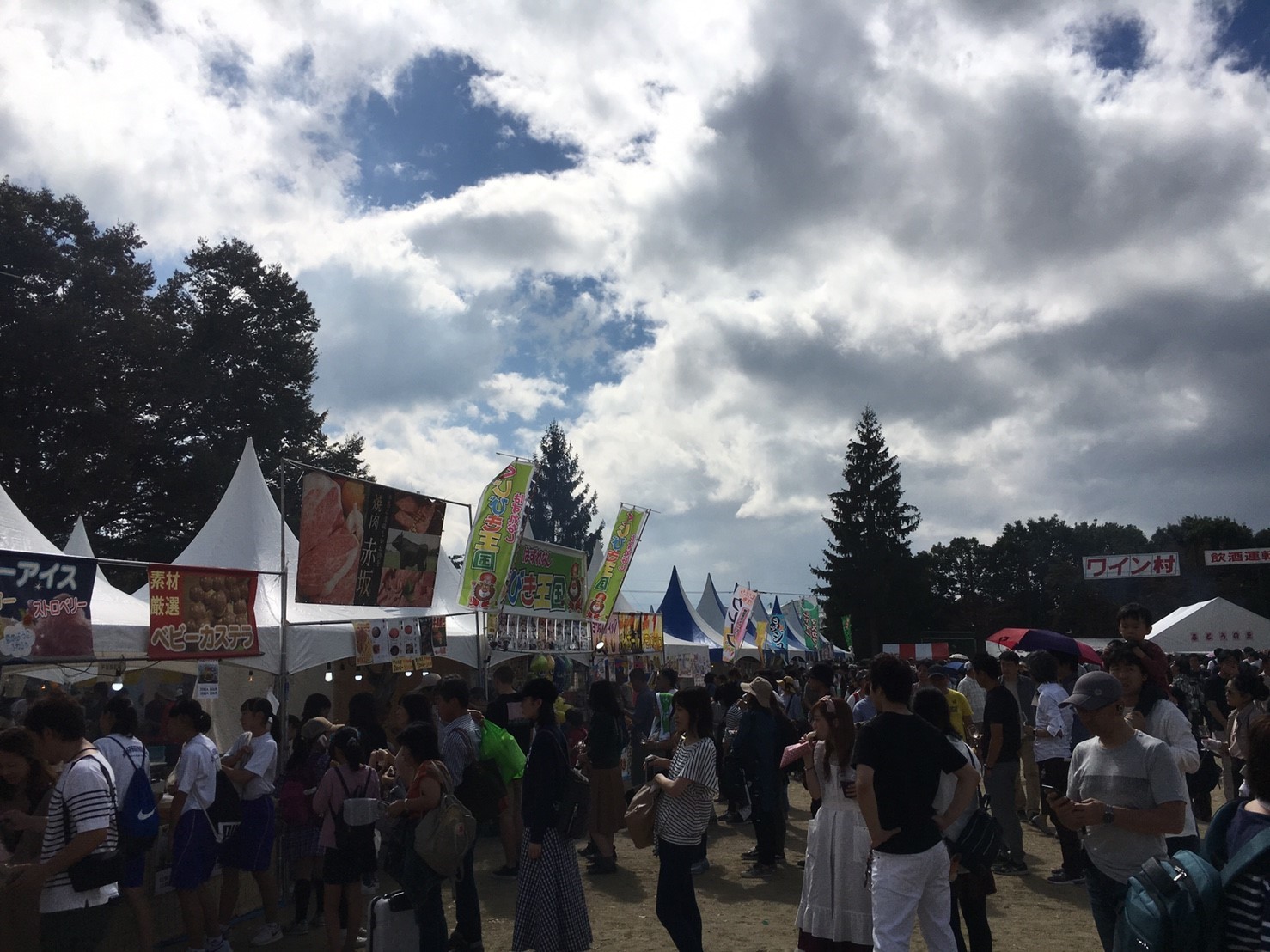 ワイン村ではワイン・ぶどうジュースの無料サービスに加え、ワイングラス(\1,000)を購入すると、市内のワイナリーの各ブースにて試飲をすることもできます。出店ブースではさまざまなワインに合う料理や子ども向けの出店などたくさんのお店でにぎわいます。