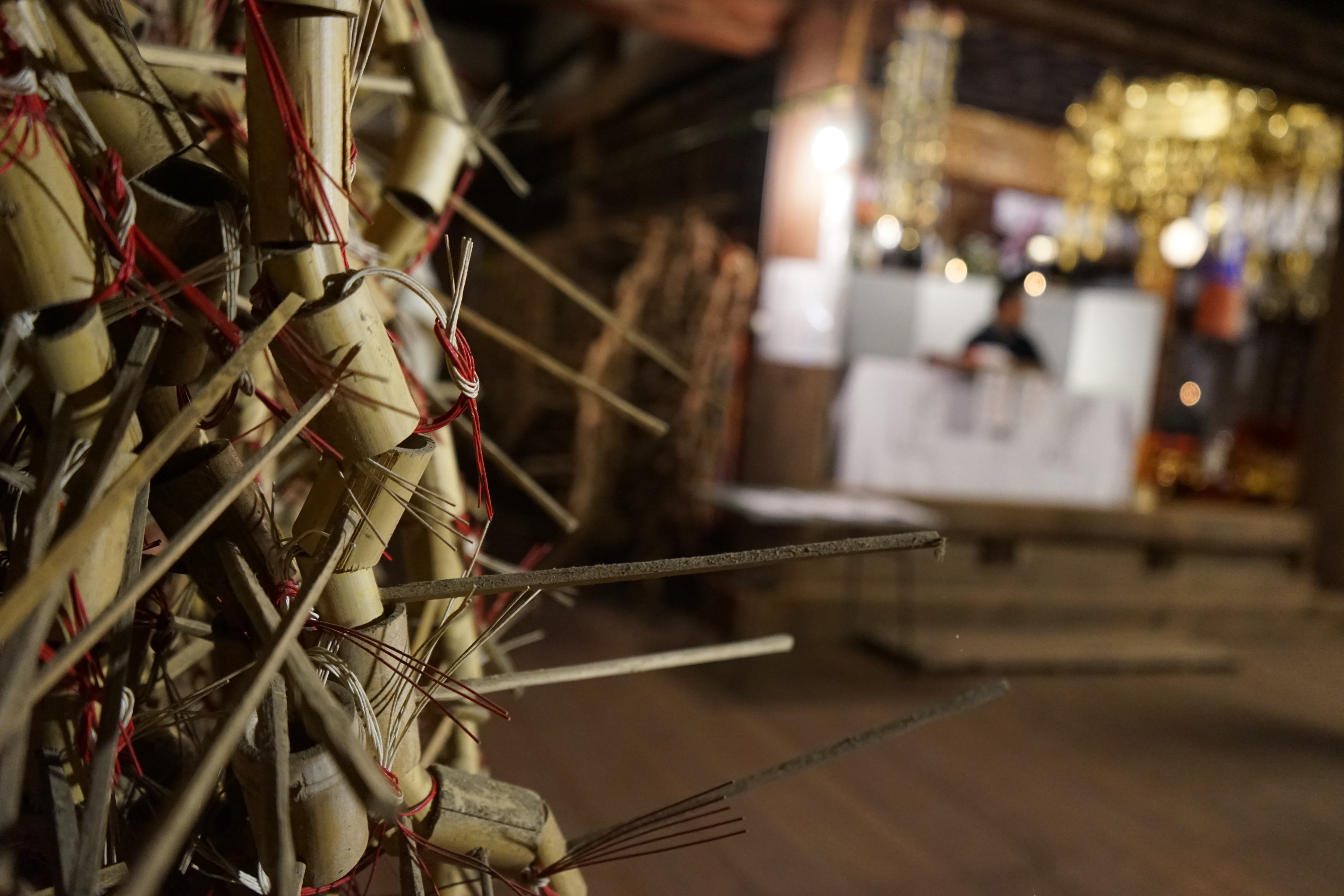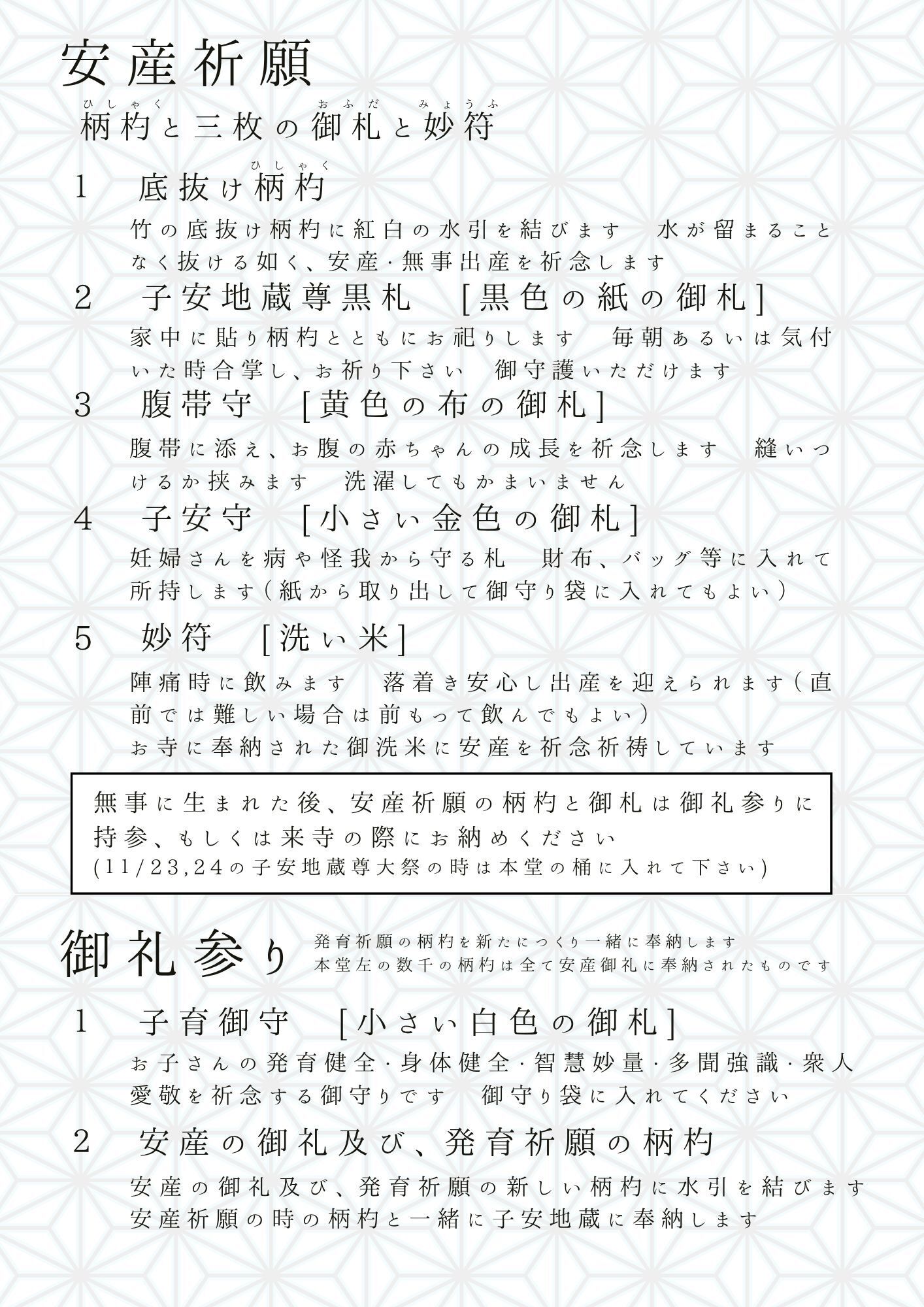 安産の御守りとするこの柄杓は底のない柄杓を用います。「底抜けの柄杓で水をすくえば水が留まることなく、その如くお産も楽(安産)に・・」と子安地蔵尊に安産祈願を行う際に、青竹の柄杓をつくり願をかけます。また、安産祈願成就者の御礼参りには、更にもう一つ柄杓をつくり、御礼参り・子育て祈願をして、安産祈願の柄杓と共に子安地蔵尊に奉納します。