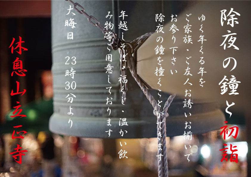 12/31 大晦日(おおみそか)の23時30分より、除夜の鐘を撞くことができます。